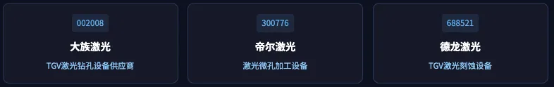 TGV激光钻孔是玻璃基板制造的核心设备,每条产线需要多台设备。目前国内设备商已具备供应能力,随着玻璃基板扩产,设备订单有望爆发。