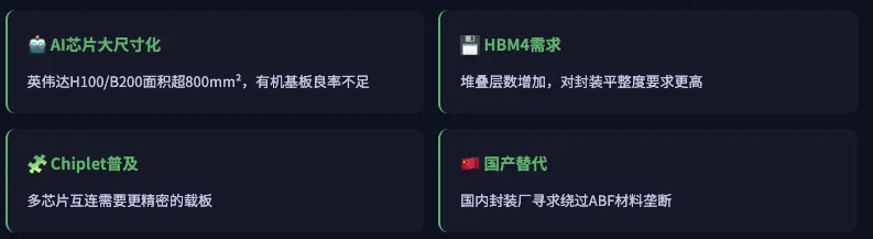 大尺寸封装的挑战:随着AI芯片面积从600mm²向1000mm²以上演进,有机基板的翘曲问题几乎无解。