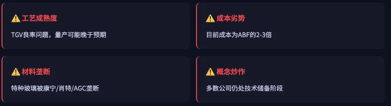 目前玻璃基板成本约为ABF载板的2-3倍,2027年量产后预计降至1.2-1.5倍,但价格仍高于有机方案。下游客户(苹果、英伟达)是否愿意承担溢价,是渗透率提升的关键。