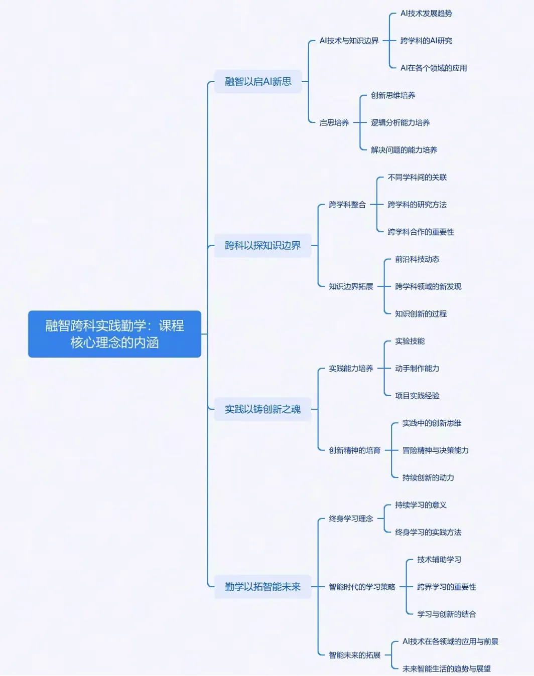 这个课程核心理念的内涵是一个有机的整体,通过融智、跨科、实践和勤学四个方面,推动学习者的全面发展和创新能力的培养。它旨在培养具备跨学科知识和创新能力的人才,为未来的智能社会提供有力的人才支持。