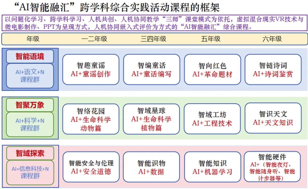 “AI智能融汇”跨学科综合实践课程由“智能语境”AI+语文+N跨学科课程群、“智聚万象”AI+科学+N跨学科课程群、“智域探索”AI+信息科技+N课程群等AI赋能的课程群组成。通过问题化学习、沉浸式学习、实践体验式学习、自适应学习、游戏化学习、智慧同侪学习、项目化学习、跨学科学习等,人工智能赋能不同的学习方式,多种学习方式共同促进学生高质量学习。