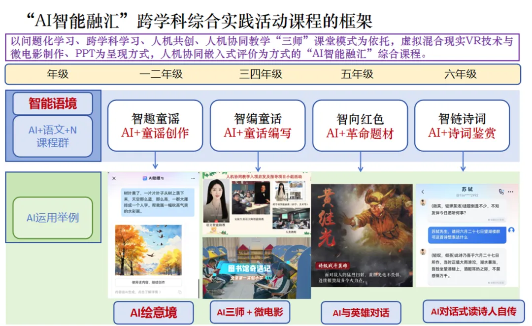 “智能语境”AI+语文+N跨学科课程群依托人机协同教学“三师”课题模式、多模态大模型分为智趣童谣(AI+童谣创作)、智编童话(AI+童话编写)、智向红色(AI+革命题材作品学习)、智链诗词(AI+诗词鉴赏)几个内容。通过AI绘意境、表达描述AI创作要素、通过AI问题化学习、AI与英雄与作者对话、AI对话式读自传、AI创作思维导图、AI人机共创有声绘本等一系列活动实现“AI智能融汇”中“智能语境”部分的课程。