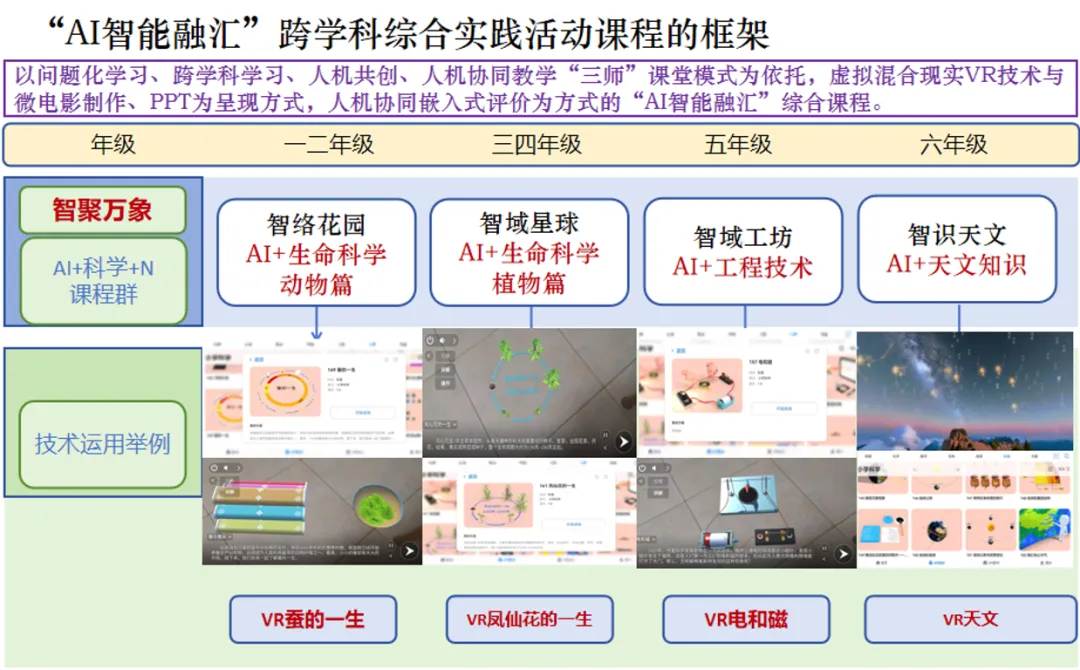 “智聚万象”AI+科学+N跨学科课程群依托虚拟混合现实VR技术和多模态多模型分为智络花园AI+生命科学植物篇、智域星球AI+生命科学动物篇、智识天文AI+天文知识、智域工坊AI+工程技术几个内容。