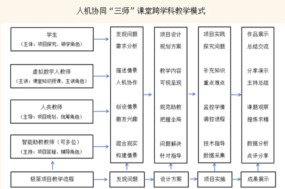 人机协同授课、协同测评、协同辅导、协同批阅、协同评价。学生是项目探究的主体,三种不同类型的教师共同协作,形成一个高度整合的教学团队,共同完成跨学科项目式授课任务。