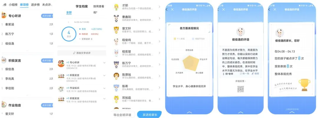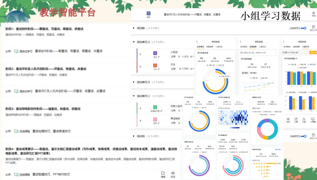 同时运用智能平台,班级优化大师,UMU互动学习平台,钉钉AI助理实现智能化管理评价环节。“课程数据”页面,教师可以看到“总体概览”“进展趋势”和“小组对比”可视化数据看板。可实现每个学生都有数字画像,查看学习任务、带教任务、学习时长、学习积分、学习数据和内容评价等数据模块。