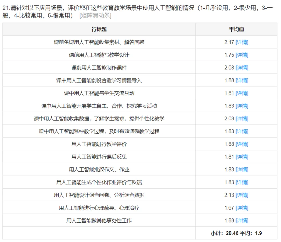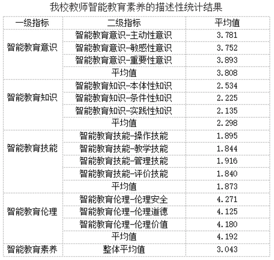 在实施“北京市人工智能助推教师队伍建设”项目时,我们进行了实践调查,针对我校小学语文教师69人作为研究对象,使用《教师智能教育素养调查问卷》,本次调研从智能教育意识、智能教育知识、智能教育技能、智能教育伦理四个维度,采用文献研究、问卷调查、访谈、实地观察和小学语文课文本分析相结合的方法,通过设计科学的调查问卷内容、调研数据分析、合理化的改进建议,深入了解小学语文教师在智能教育素养方面的现状、需求和困惑。逐步深入探索人工智能在小学基础教育的应用现状、优化策略与实施路径。根据调研报告提出提升小学语文教师智能教育素养的对策建议,我们进行了有针对性的人工智能校本研修培训,提高了教师们应用人工智能教学的技能。