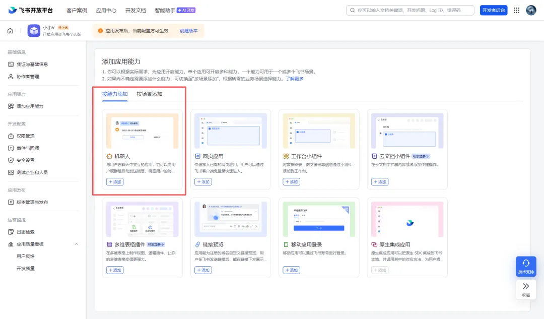 2、为我们刚刚创建的应用添加应用能力-机器人