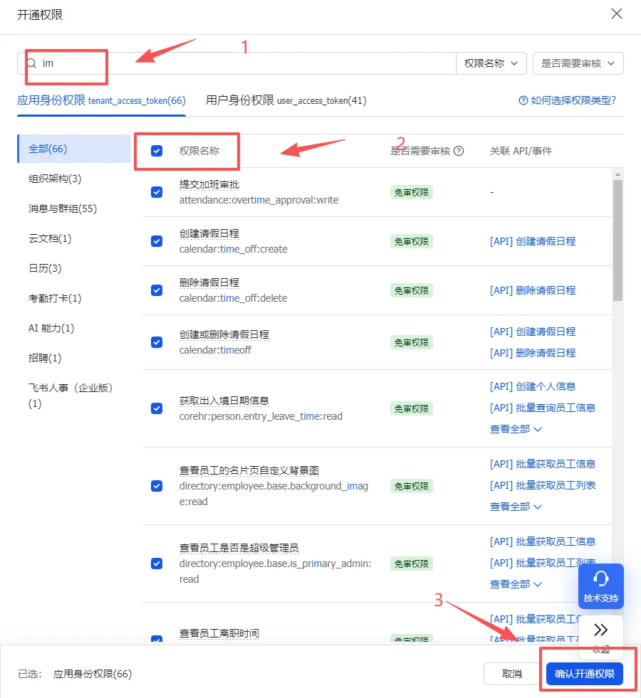 3.1、点击开通权限在搜索栏输入“im”点击全部勾选-一共66个权限