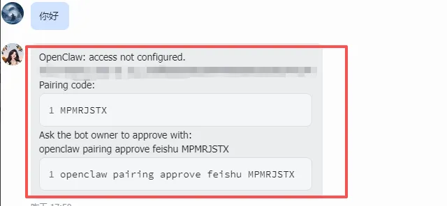 给他发消息、机器人会回复你一串配对码-把这串配对码交给openclaw去配对好-如果遇到超时问题-让他直接跳过配对-以加入白名单的方式跳过配对。