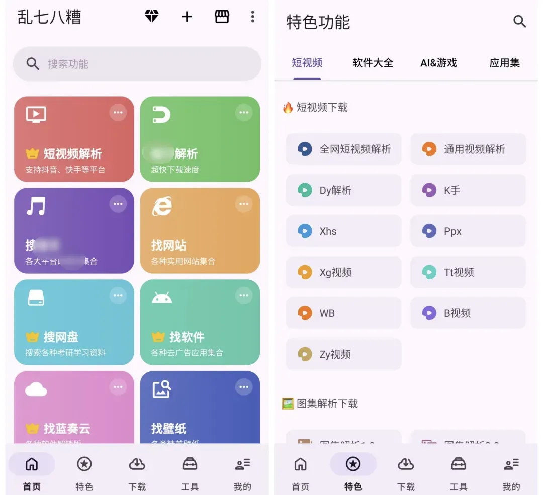 一款重量级的安卓聚合工具箱,就跟软件名字一样,功能多到"乱七八糟"!它集成了十多种资源搜索功能,还有上百种实用工具,找软件、搜网盘、短视频去水印统统都有,一个APP就能解决日常生活中的各种需求。