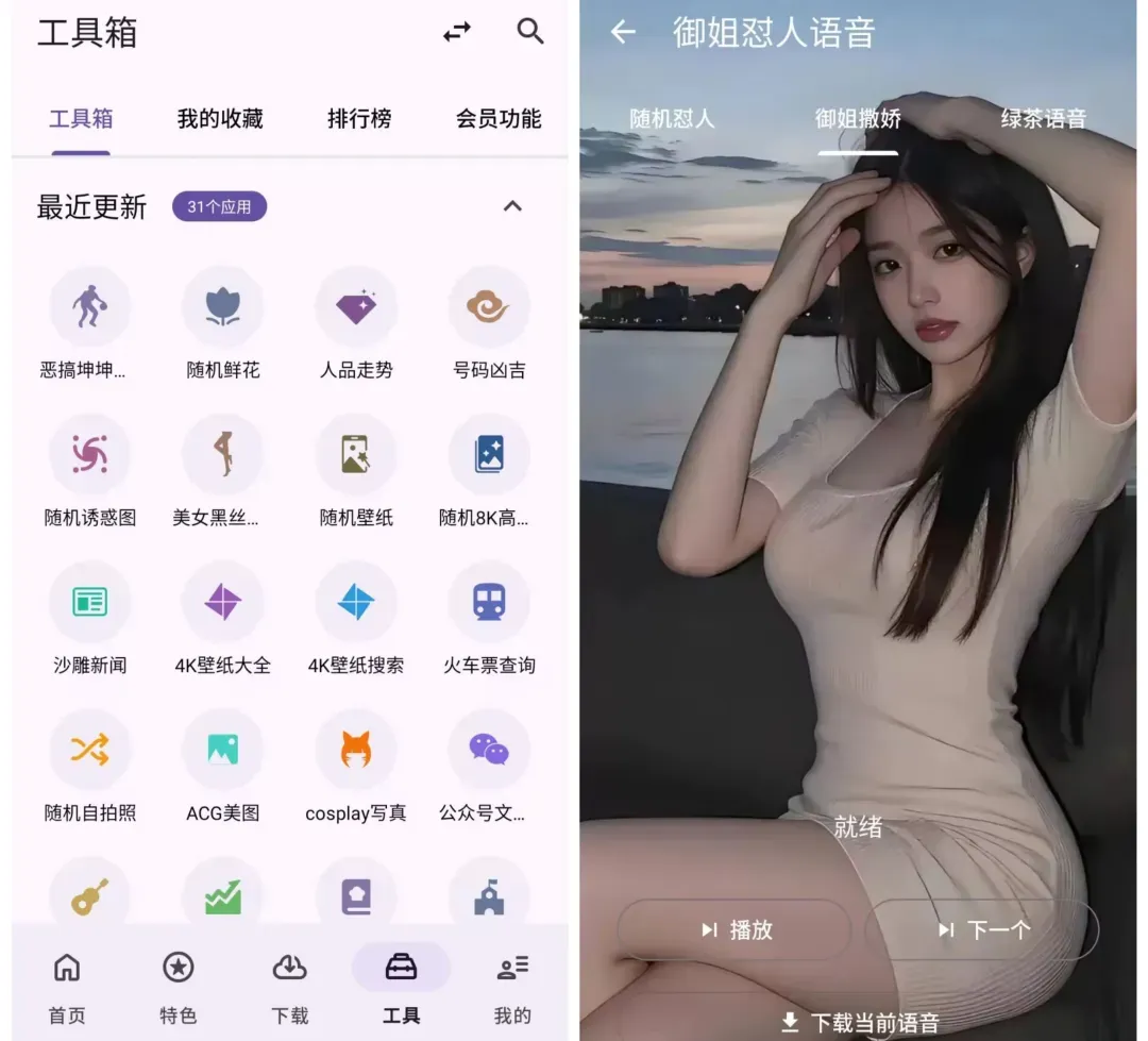 "工具"板块大更新,一口气新增31个应用:黑丝美女图片、随机壁纸、菜谱查询、火车票查询、御姐撒娇……应有尽有。