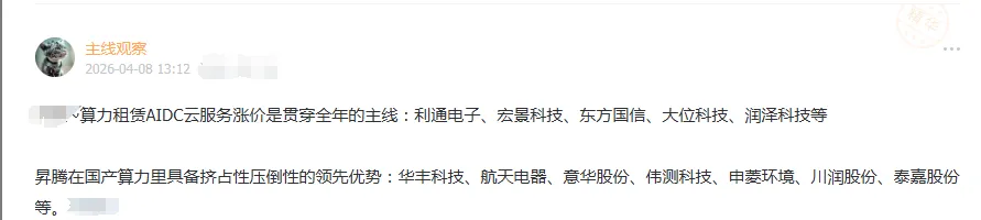 协创数据26Q1净利预增284%-402%,打响算力租赁利润兑现第一枪。海外高端GPU租金持续涨价,行业正从硬件转租向Token服务升级,头部厂商估值逻辑迎切换。