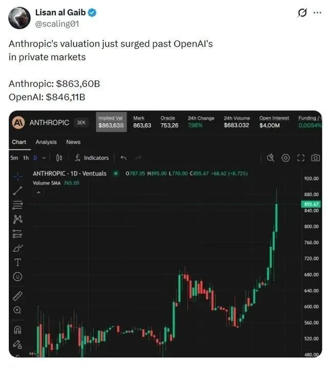估值:Anthropic1 万亿 +,OpenAI8000 亿