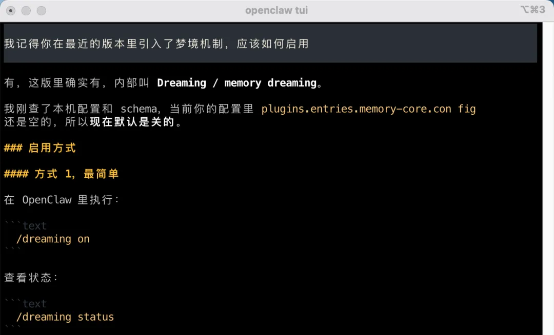 Q:梦境机制会删掉我的重要数据吗?不会。梦境机制做的是"压缩和重组",不是"删除"。重要的信息会被保留,只是以更高效的方式存储。Q:多久"做"一次梦?默认情况下,当空闲时间超过设定阈值或记忆量达到上限时触发。通常一天会触发1-2次。你可以在配置中调整触发条件。Q:这个功能耗资源吗?梦境整理发生在 AI 空闲时,不会影响正常使用。从我自己的使用来看,对服务器性能的影响几乎可以忽略。
