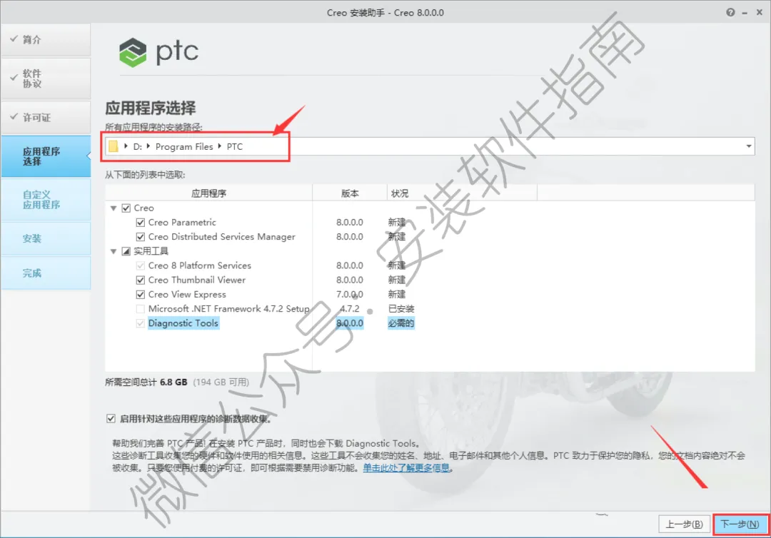 16.点系统会自动识别到许可路径,(如果没有识别,点击【添加许可证源】,选择到D:\Program Files\PTC\PTC_D_SSQ.dat 路径即可),然后点击【下一步】