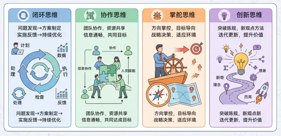 职业化,说白了,就是让人觉得你“靠谱”。在我的成长模型里,职业化包含四种思维:闭环、协作、掌舵、创新。我想重点说说其中两个,在AI时代感受最深的两个。
