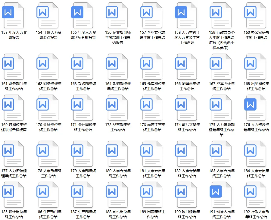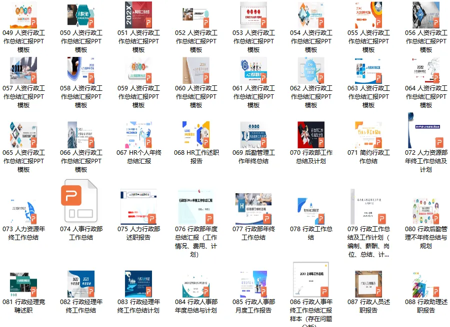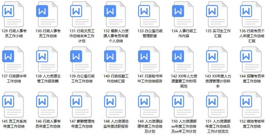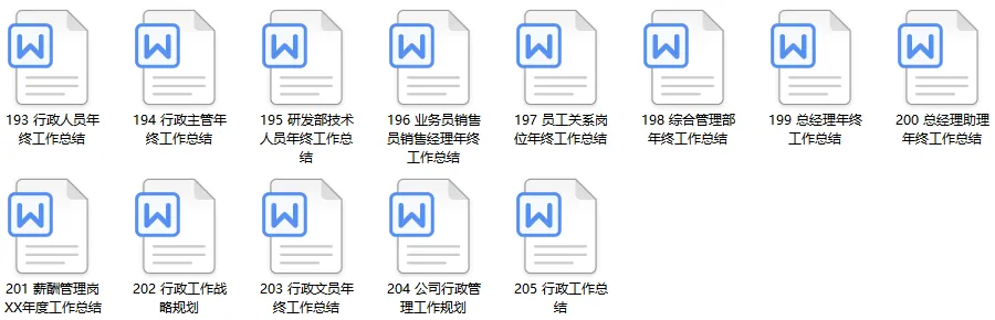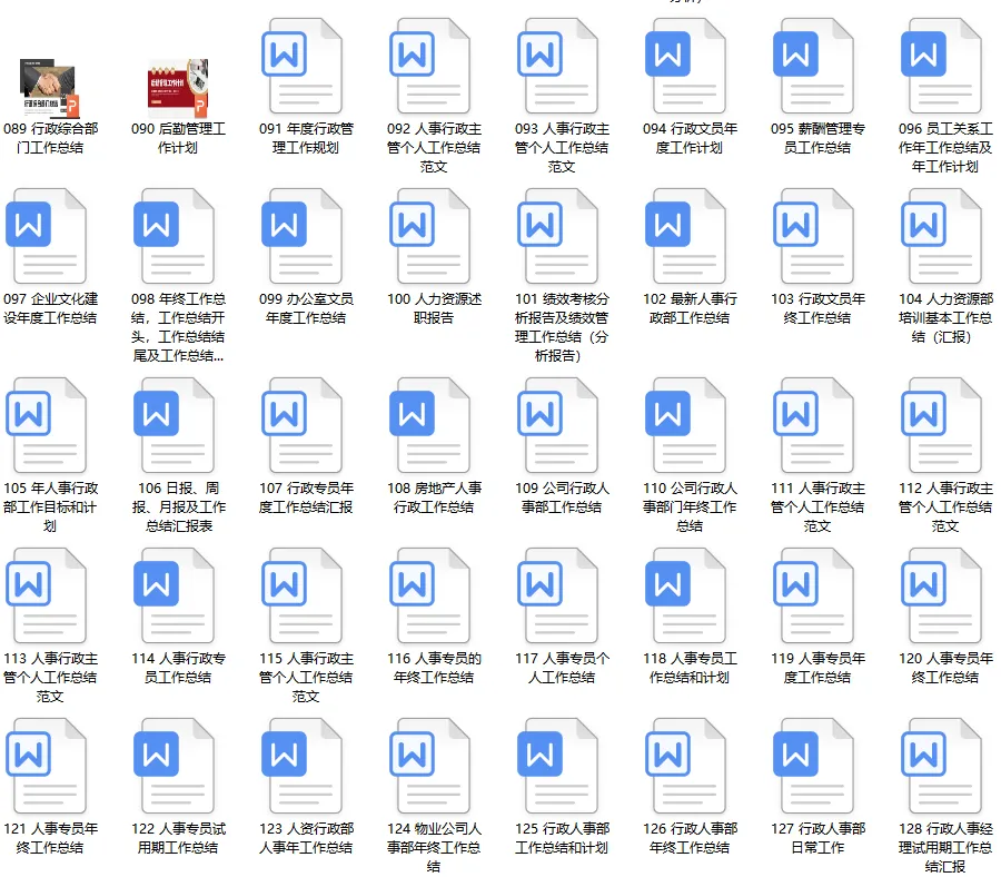 《HR行政工作总结》资料包内含90份人资行政工作总结计划PPT模板、115份人事行政各岗位(人事专员、行政专员、人事经理、行政经理、薪酬专员、行政助理、人事主管、行政后勤、绩效专员、企业文化专员、员工关系专员等)工作总结参考文本,共计205份文件。