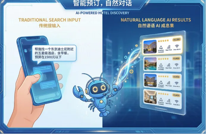 •自然语言搜酒店:不用再打开各种App 繁琐地筛选,直接对 OpenClaw 说:"帮我找一家东京迪士尼附近、带早餐、适合带小孩的五星级酒店,预算一晚 1500 以内。"它就能精准返回符合条件的酒店列表。
