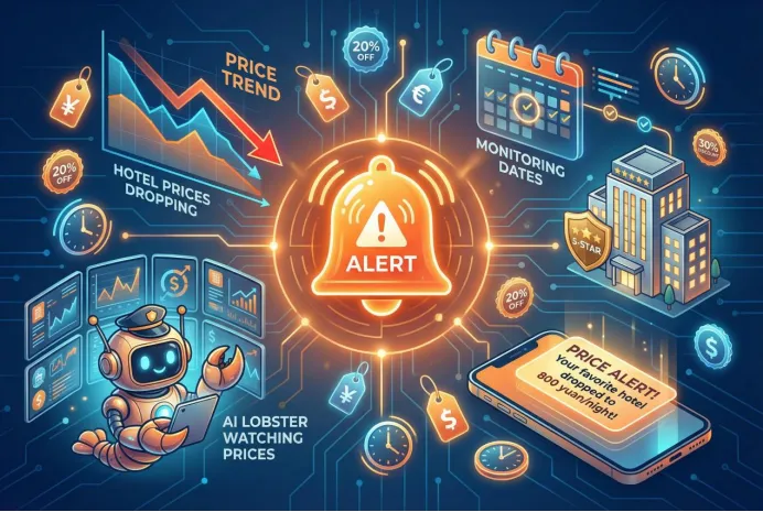 你可以给OpenClaw 设定一个自动化任务:"每天早上 9 点,帮我查询三亚海棠湾的五星级酒店,如果有低于 800 元/晚的,立刻发微信/飞书提醒我。"