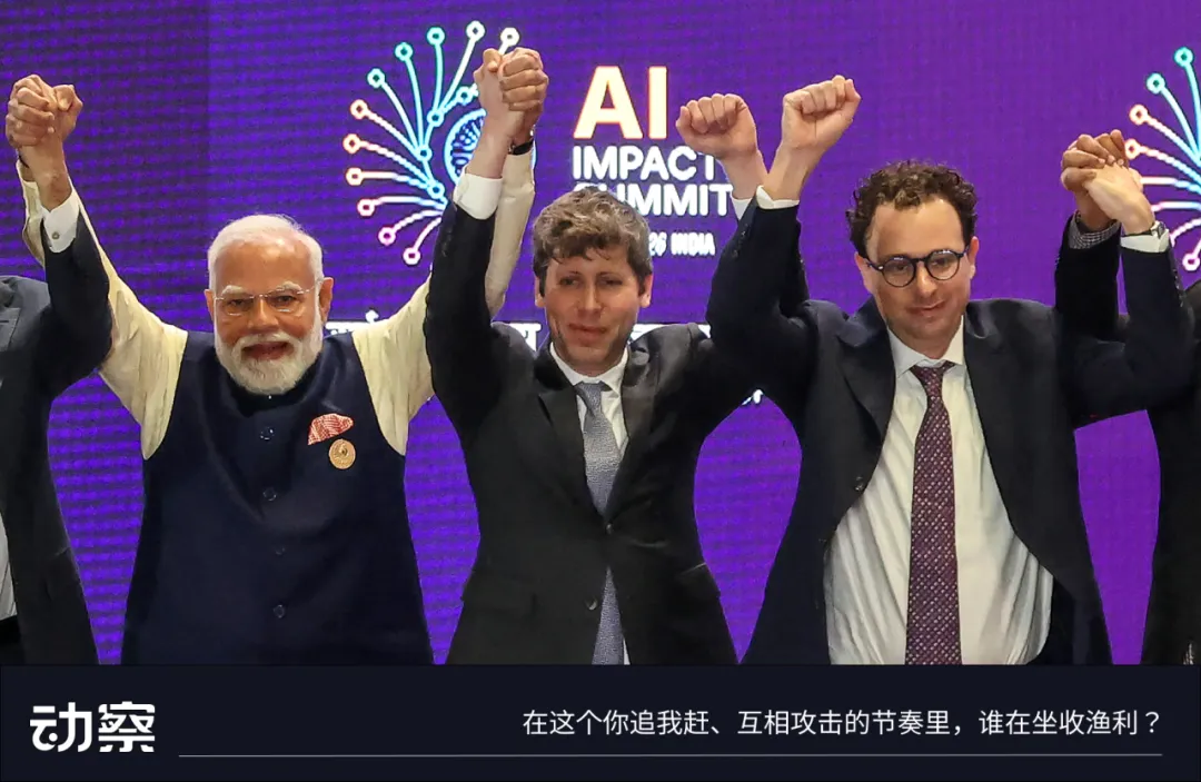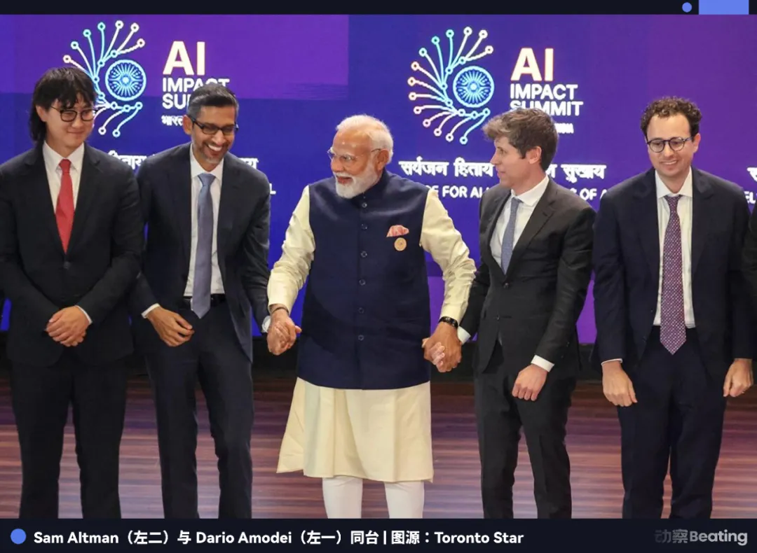 2 月 19 日新德里 AI 峰会上,莫迪邀请台上十三位科技领袖手拉手合影。所有人都照做了,除了站在相邻位置的 Altman 和 Dario 。两人各自举起拳头,没有任何身体接触,这个画面在社交媒体上病毒式传播。 Altman 事后说自己不知道发生了什么, Dario 没有公开评论。