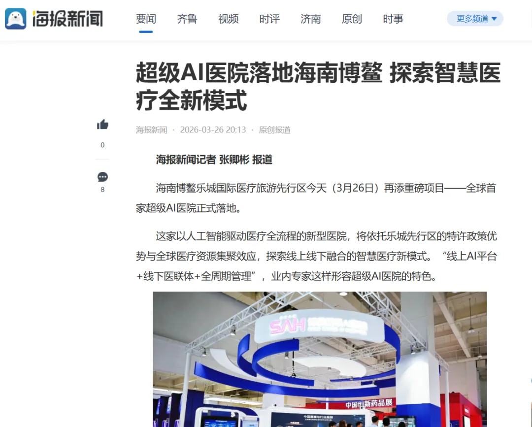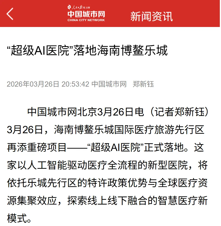 3月26日,全球首家超级AI医院——海南博鳌超级数智医院正式落地。人民日报中国城市网、人民日报党媒平台、新华社经济参考报、光明网、中国网、中新社中国新闻网、人民政协网、中国财经报、中国经济时报、中国发展网、中国科技网、中国工业新闻网、新京报、封面新闻、海报新闻等媒体进行了报道。