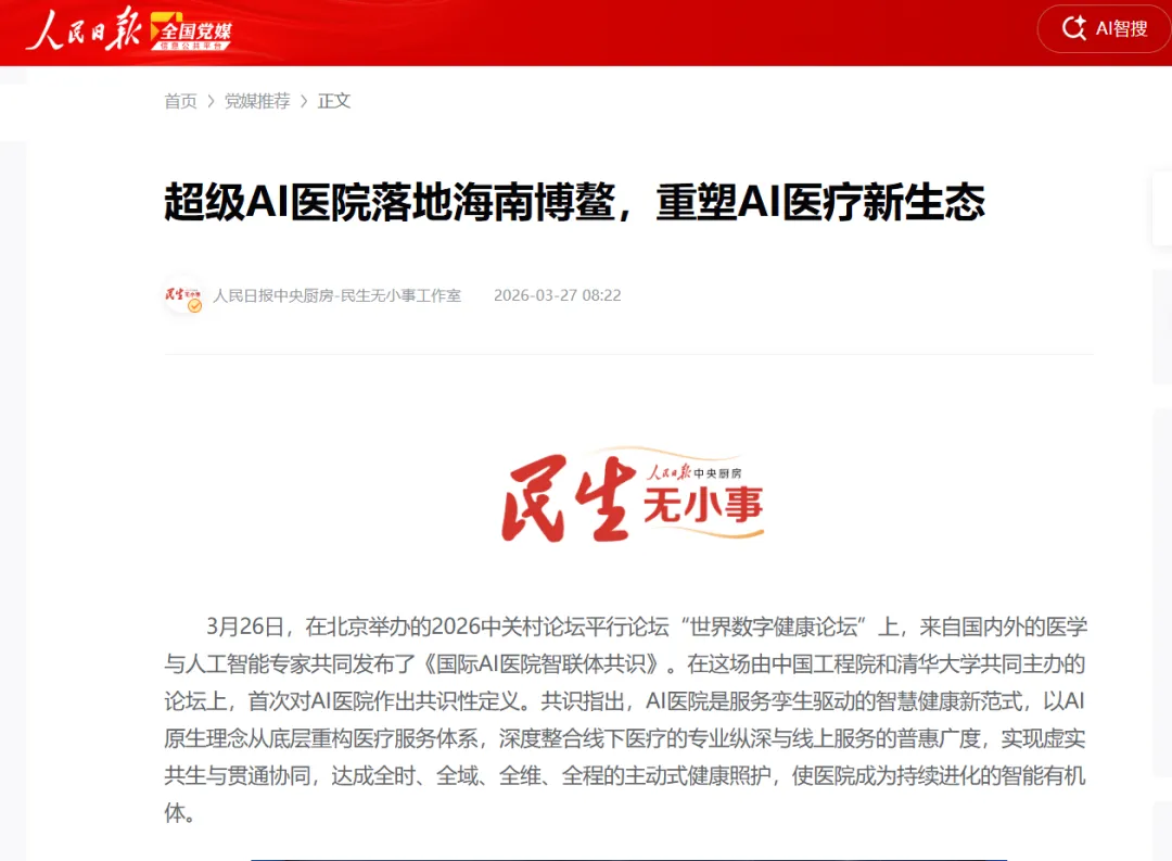 人民日报-党媒平台:超级AI医院落地海南博鳌,重塑AI医疗新生态