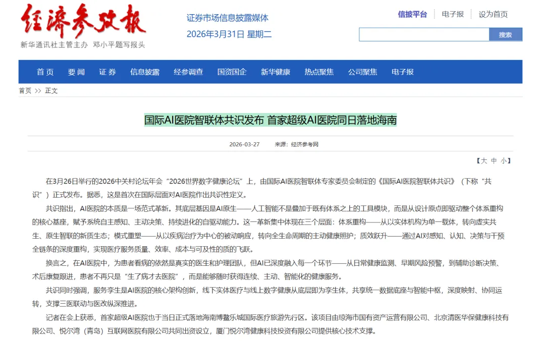 新华社-经济参考报:国际AI医院智联体共识发布 首家超级AI医院同日落地海南