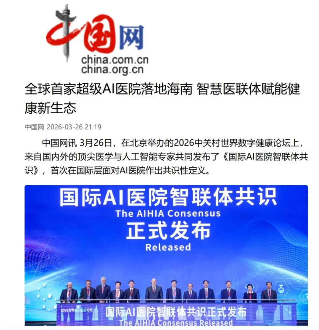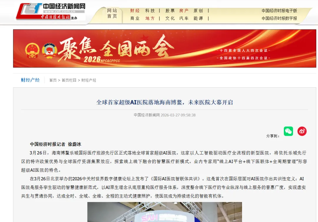 中国经济新闻网:全球首家超级AI医院落地海南博鳌,未来医院大幕开启