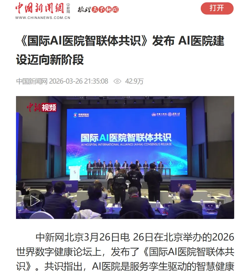 中新社-中国新闻网:《国际AI医院智联体共识》发布 AI医院建设迈向新阶段