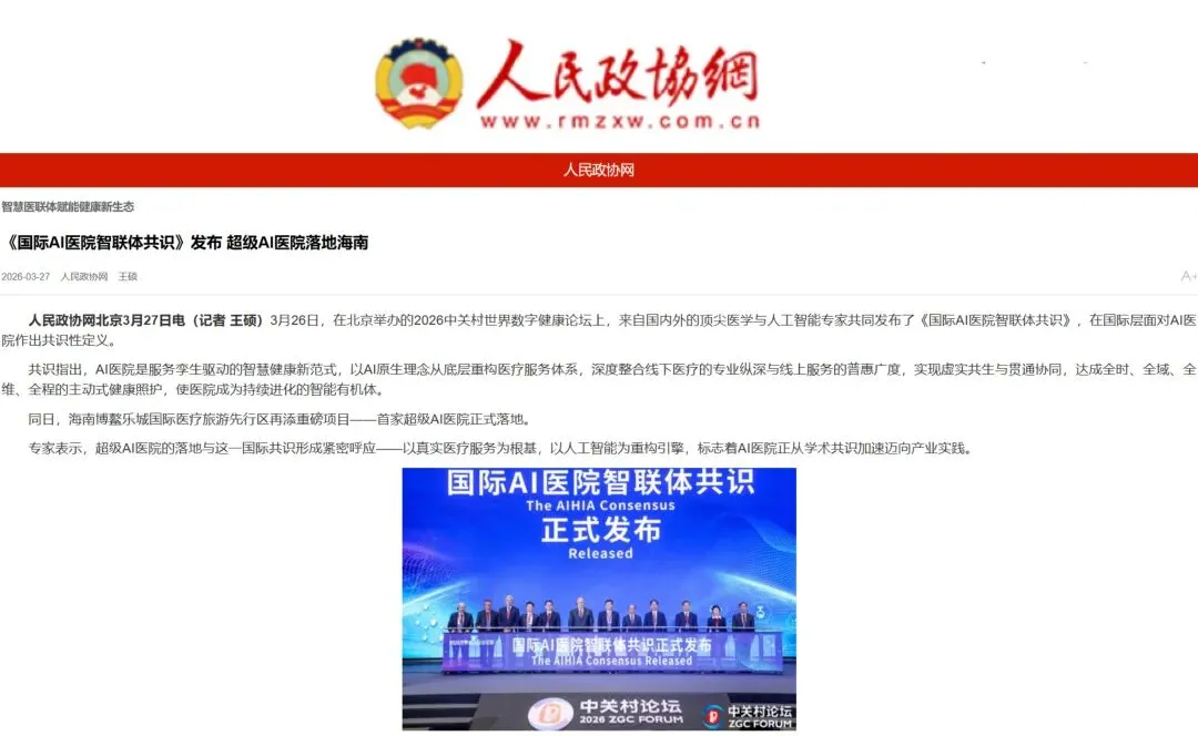 人民政协网:《国际AI医院智联体共识》发布 超级AI医院落地海南