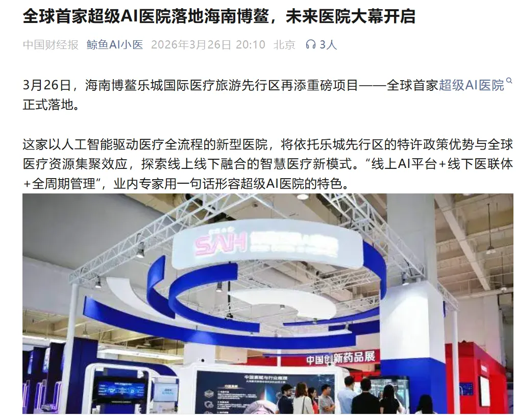 海南博鳌乐城国际医疗旅游先行区今天(3月26日)再添重磅项目——全球首家超级AI医院正式落地。