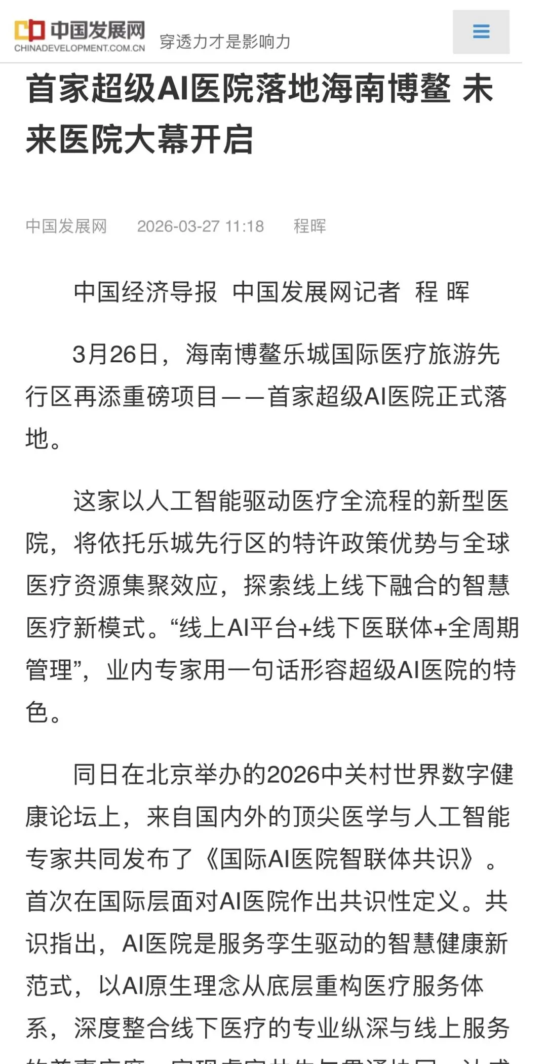 中国发展网:全球首家超级AI医院落地海南博鳌,未来医院大幕开启