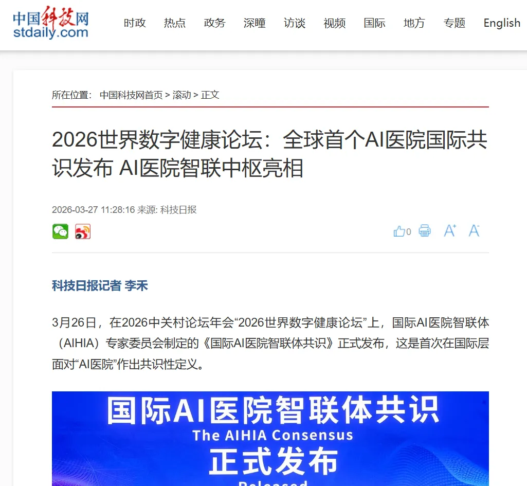 中国科技网:2026世界数字健康论坛:全球首个AI医院国际共识发布 AI医院智联中枢亮相