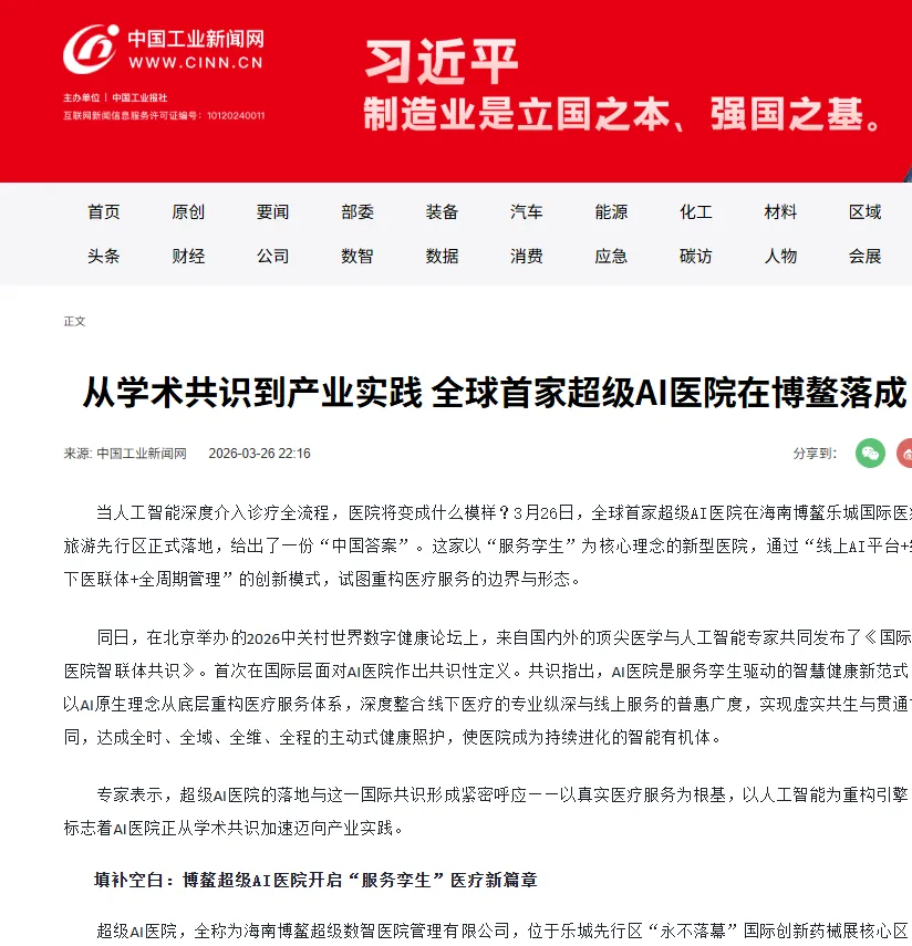 中国工业新闻网:从学术共识到产业实践 全球首家超级AI医院在博鳌落成