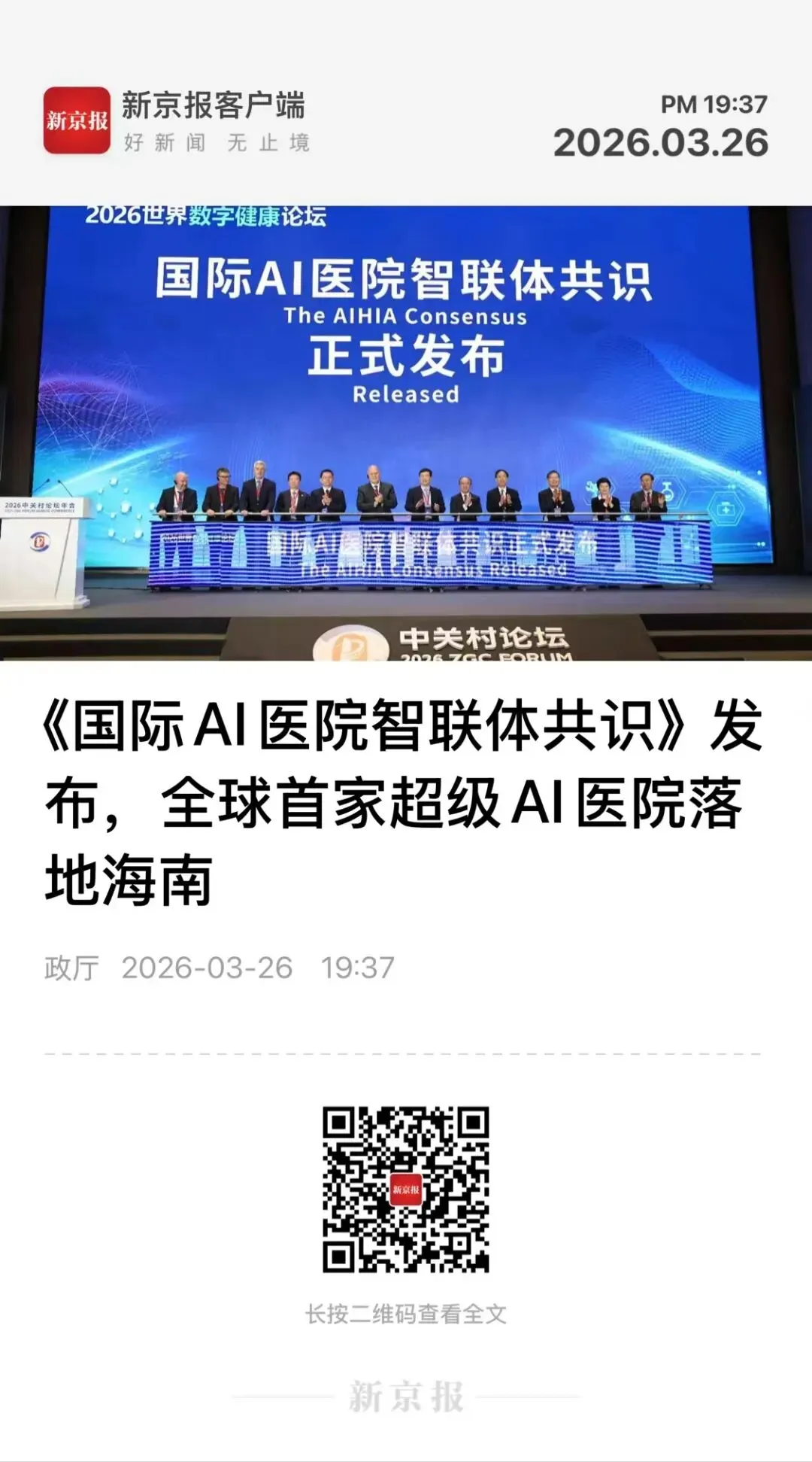 新京报:《国际AI医院智联体共识》发布,全球首家超级AI医院落地海南