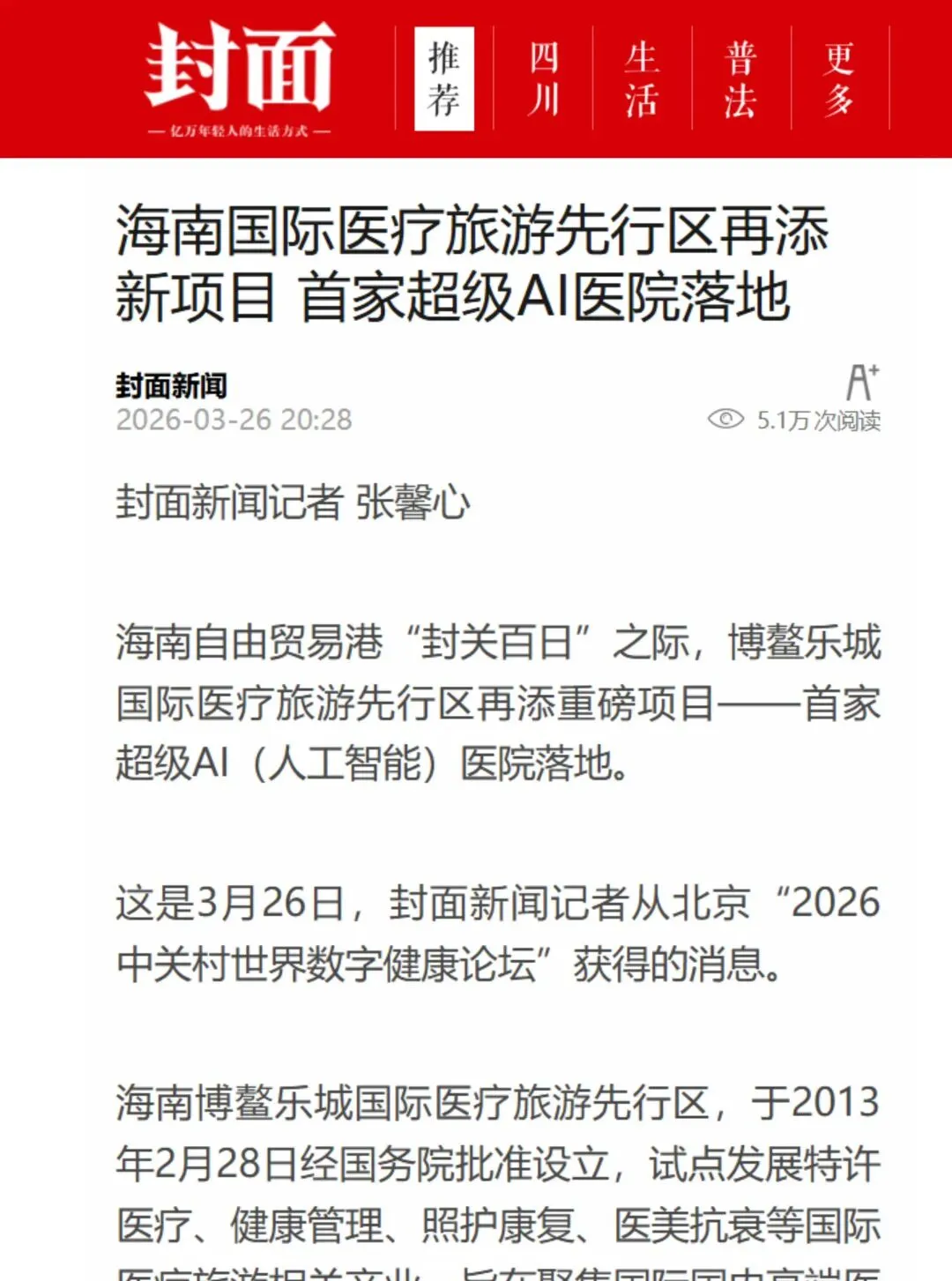 封面新闻:海南国际医疗旅游先行区再添新项目 首家超级AI医院落地