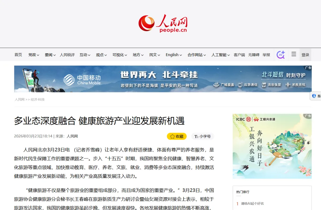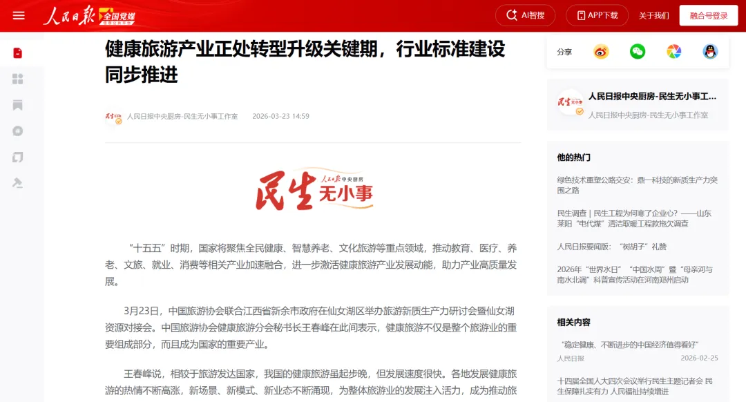 人民日报-党媒平台:健康旅游产业正处转型升级关键期,行业标准建设同步推进