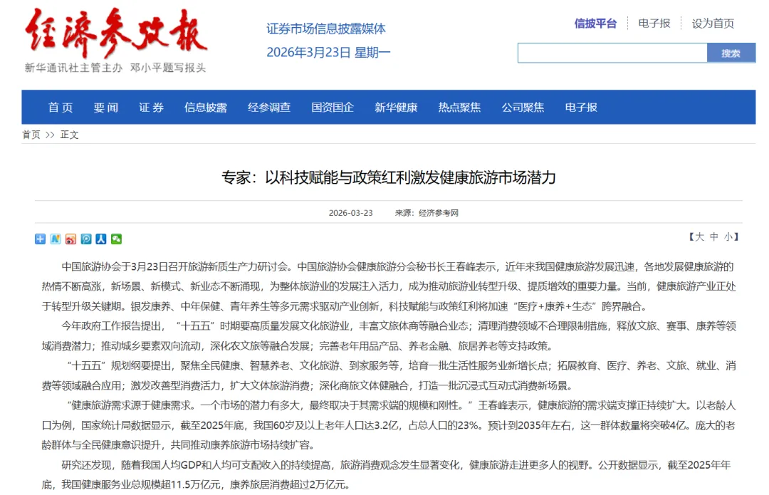 新华社-经济参考报:专家:以科技赋能与政策红利激发健康旅游市场潜力