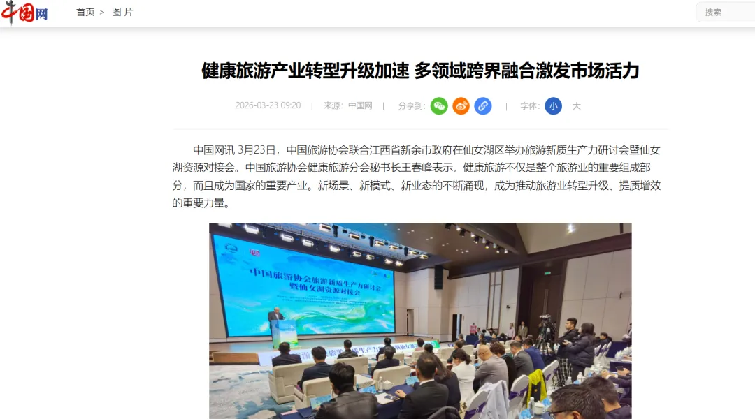 3月23日,中国旅游协会联合江西省新余市政府在仙女湖区举办旅游新质生产力研讨会暨仙女湖资源对接会。中国旅游协会健康旅游分会秘书长王春峰解读健康旅游产业发展机遇,其理事单位悦尔湾健康介绍了悦尔AI在健康旅游领域的深度应用及相关实践项目。人民日报、新华社・经济参考报、人民网、光明网、中新社・中国新闻网、中国网、科技日报、人民政协网、中国发展网、中国经营报、中国经营网、中国财经报、中国经济新闻网、中国城市报、中国工业新闻网、新京报、封面新闻、海报新闻等媒体进行了报道。