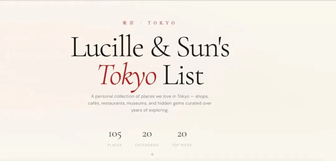 大意就是,我有两个 Google Maps 列表,你帮我参考 Zara 那个网站的风格,做一个我们的版本,名字叫 Lucille & Sun's Tokyo List,只选东京的地点。