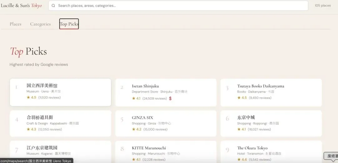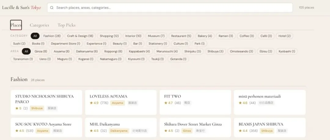 前几天刷到 Zara Zhang 分享了她做的一个网站,zaraintokyo.com,把她在东京喜欢的店,按区域、分类整理好了,点一下直接跳 Google Maps。
