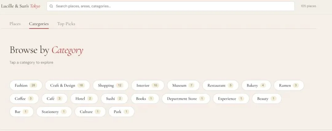 105 个东京地点。20 个分类。可以搜索,可以按分类和区域筛选。