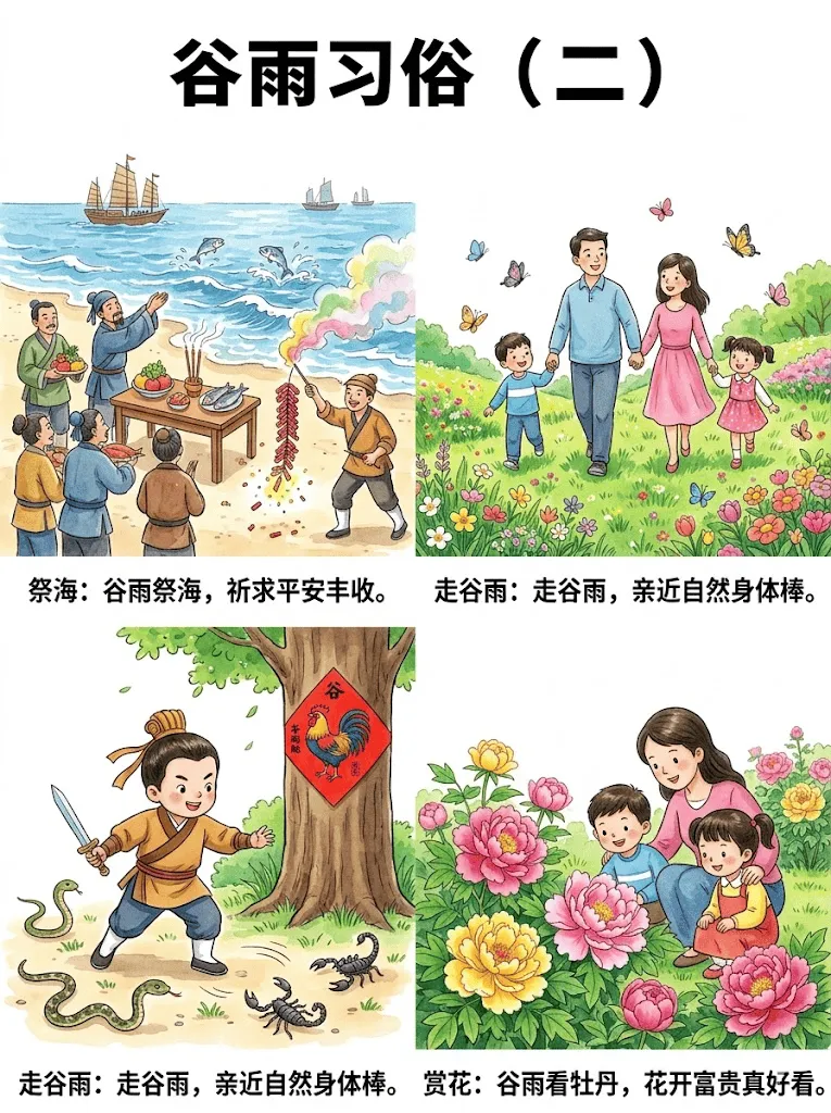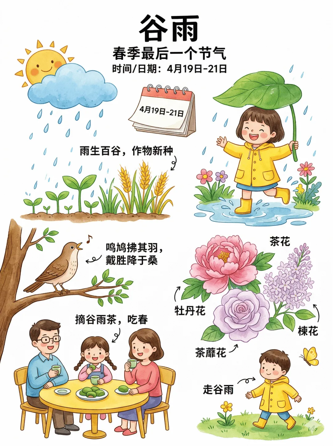 🌸 【带着神兽体验谷雨习俗】走谷雨:春天这么美,带娃去户外散步亲近自然,身体棒棒哒!“吃春”与品茶:给孩子做一顿香椿炒鸡蛋,营养又健康;大人还可以喝点谷雨采摘的新茶,清火又明目。赏花与祭海:带娃去公园赏牡丹,看看“花开富贵”有多美!除了牡丹,谷雨的花信风还有荼蘼花和楝花哦。海边的朋友还可以看看祭海仪式,祈求平安丰收。