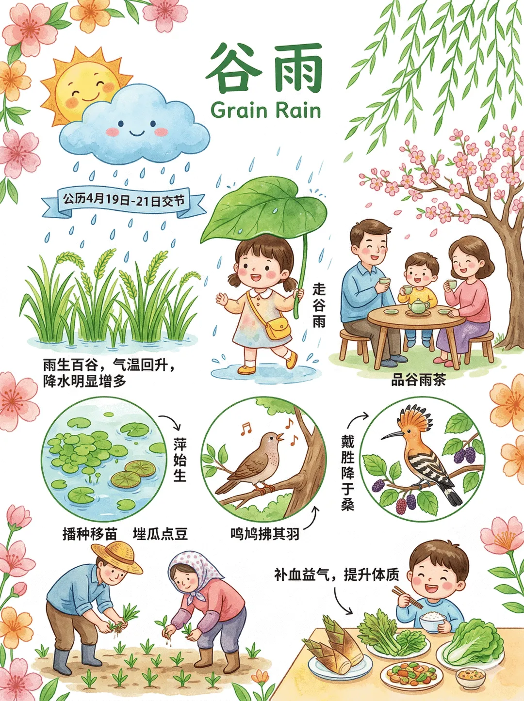 🌦️ 【谷雨的气候:春雨绵绵】 以秦岭-淮河为界,南方(长江中下游、江南、华南等地)春雨绵绵,空气变得非常湿润;而北方虽然春雨少,但也迎来了终霜和初雷。