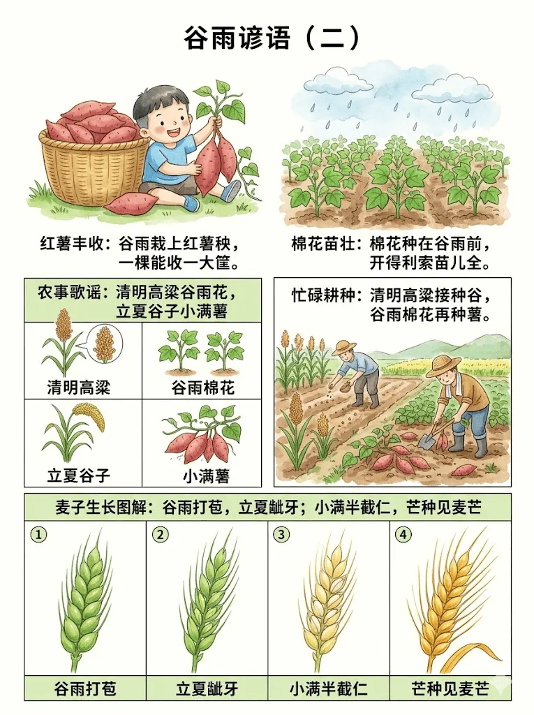 🌾 【教娃几句农事谚语】 谷雨正是播种移苗、提升体质的好时节:“谷雨前后,种瓜点豆”:周末不如在家里阳台上,陪娃亲手种下几粒种子吧!“过了谷雨种花生”、“苞米下种谷雨天”。“清明高粱接种谷,谷雨棉花再种薯”。