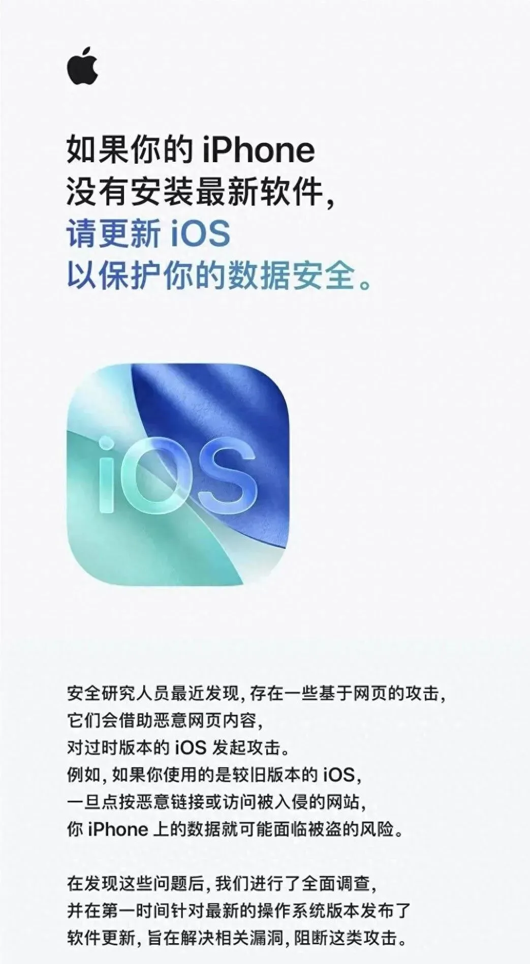 近日,据财联社报道,Apple公司通过官方渠道发文提醒称,安全研究人员发现,存在针对过时版本iOS的网页攻击风险,攻击者可借助恶意网页内容对设备发起攻击。苹果建议用户尽快将系统更新至最新版本,以保障数据安全;对于无法更新的设备,可考虑启用“锁定模式”等功能以降低风险。