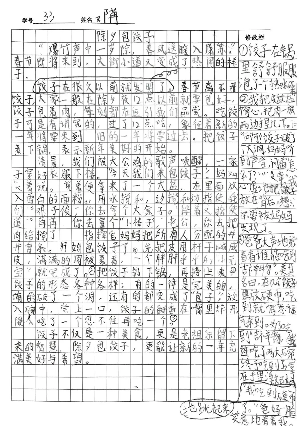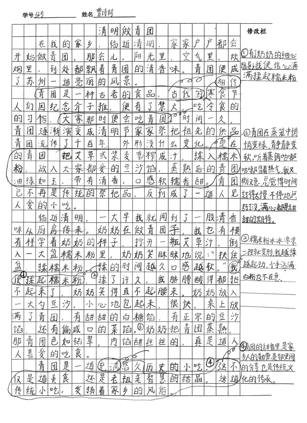 学生拿到评改意见后,自主完成作文修改。针对学困生修改困难的问题,每个班级成立6-8个修改小组,按习作能力分层搭配、以强带弱。前几次由小组组长带领学困生修改,让学困生边看边学;经过三五次实践后,所有学生都能掌握修改方法,实现自主修改。所有修改后的作文,需经教师审核通过后,学生才能正式誊写。