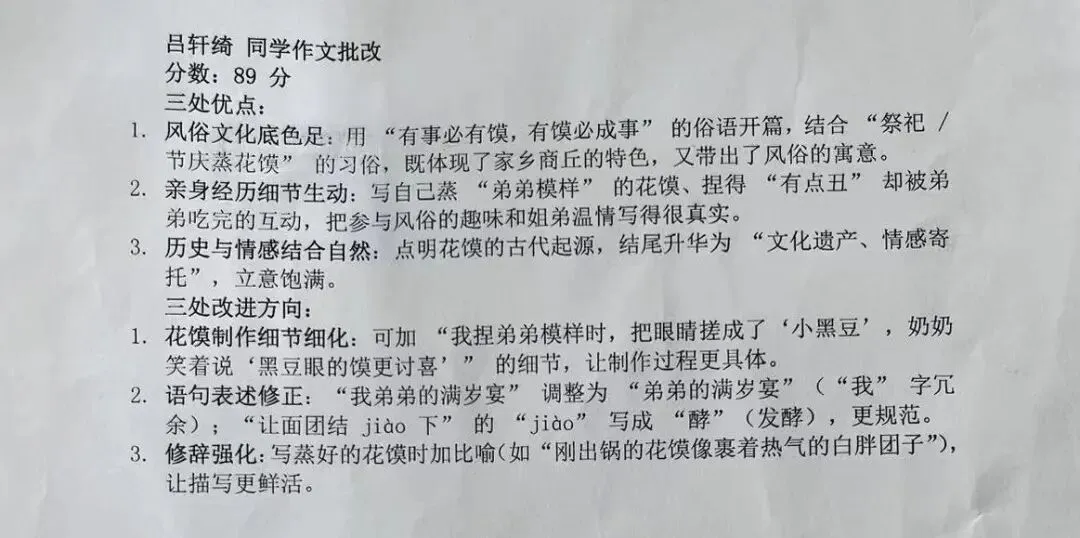 教师将全班学生的作文草稿统一拍照导入智能体,结合作前指导课的评价要点,输入专业、具体的评改指令,让智能体为每篇作文生成个性化评改意见。随后教师对智能体的评改意见逐篇阅读、把关调整,定稿后打印出来贴在作文草稿反面,实现上午写作文、下午学生拿到修改意见的高效反馈。
