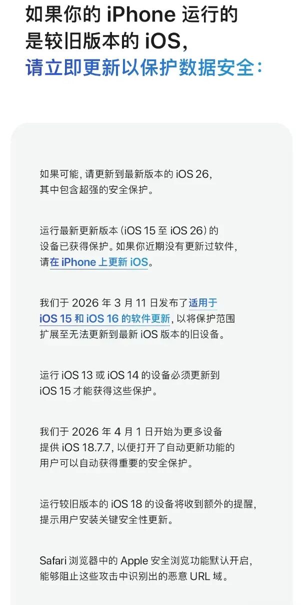 苹果公司表示,在发现相关安全问题后,已第一时间完成技术调查,并向最新操作系统推送紧急修复更新 。不同机型对应修复版本不同:新机型可升级至iOS 18.7.7或iOS 26.4.1及以上,无法更新至最新系统的旧机型,需升级至iOS 15.8.7或iOS 16.7.15等专属安全版本。此次更新并非功能优化,而是专门封堵漏洞、阻断潜在攻击路径的关键安全补丁 。