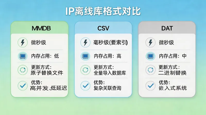 IP归属地离线库通常提供多种格式,各有优劣。纯IP查询场景首选MMDB;需要与业务数据JOIN分析时选CSV导入MySQL/ClickHouse。